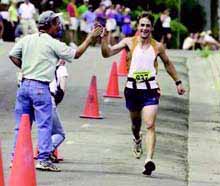 "It was sort of an 'Uh-oh,'" Koch said. "I'm not really a downhill runner. I needed more of a gap." Colorado Springs' Laura Mitchell, 39, was second to Larson in 5:04:11, followed by 21-year-old Andrea Wiegand of Lincoln, Neb., in 5:06:59. Mitchell could barely believe her time in her first Pikes Peak Marathon. She saw Larson when Larson was returning and knew catching her was futile. Folks at the aid stations told her she was in second, and that was a thrill in itself. "I couldn't keep up with Erica at that time," she said. Meanwhile, the attention-shy Larson was quietly going about her business. It's something she's good at. Larson ran on scholarship at Marquette University. She got her Ph.D in chemistry at age 27. She has so many running trophies she gives them to a local youth club to save space. But when she found out Saturday that elite runner Lusk had entered the marathon, she spent the night fretting. Her fears seemed to be justified as she watched Lusk, who competed in the 2000 Olympic marathon trials, blaze away at the start on Manitou Avenue. "I saw her way up there and said, 'Well, I might not see her again,'" Larson said. "I'm not going to sprint. It's not worth it. I just needed to do my own thing to survive." So Larson bided her time. At Barr Camp, Larson caught Lusk, who dropped out soon after. A few hours later, Larson was back on the stage, where, she confesses, "I feel weird. I feel like, 'Who am I? Why should people be getting their awards from me?'" Larson said she'll probably return in 2003, when she has the chance to become the first woman in Pikes Peak Marathon history to win five straight titles. Maybe by then, the spotlight won't seem so strange.