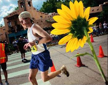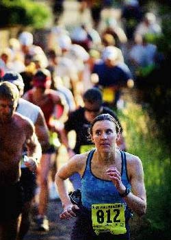 It was a great exciting race. I was just happy that I could keep up with someone like that. Mudge, 33, of Tavistock, England, finished fourth overall and set a 30-34 agegroup record time of 4:19:38. She broke the 15-year-old mark by 16 minutes and 56 seconds. But Mudge was disappointed. Looking at the times last year, Mudge said. I thought I had a stiff chance of winning. Larson came in seventh overall. Ilgen said it is rare for this race to have two women in the top 10. Thats amazing, Larson said. Its got be one of the most competitive races in a long time. Larson finished at 4:22:29, 19 minutes and 24 seconds faster than her winning time last year.