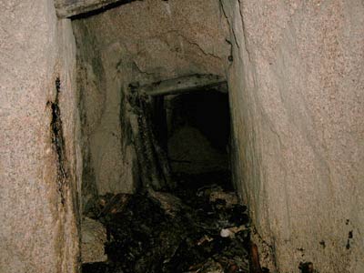 At 317' into the side tunnel we came upon another blast shield. Although there was no water in the side tunnel it was very humid. In fact if you look closely on the right side of the photo that is fog from our breathing hovering in the air.