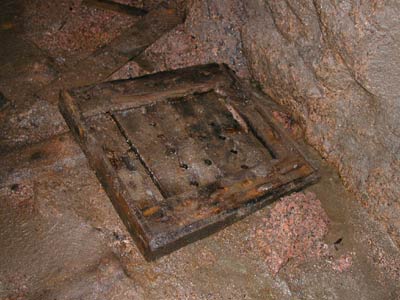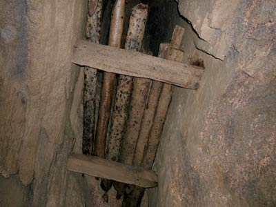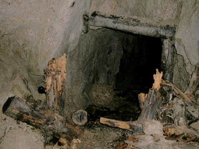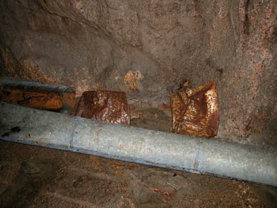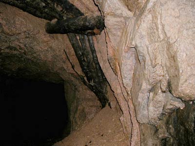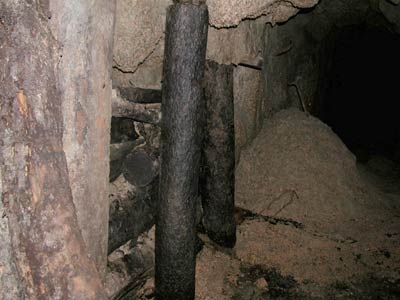 As you pass by 600' you can see some timbers going up the wall and over your head. I may be wrong but these do not look like they are there to hold up the tunnel at this point but rather they look like they are there to divert dirt and rocks to the side of the tunnel. In fact you can see a collection of dirt on the bottom of this one.