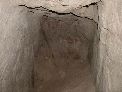 At 317' into the side tunnel we came upon another blast shield. Although there was no water in the side tunnel it was very humid. In fact if you look closely on the right side of the photo that is fog from our breathing hovering in the air.